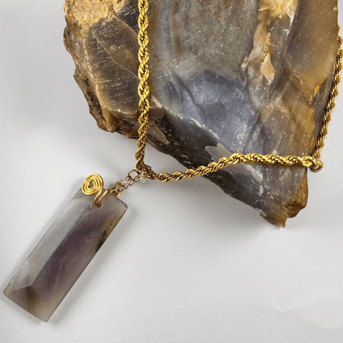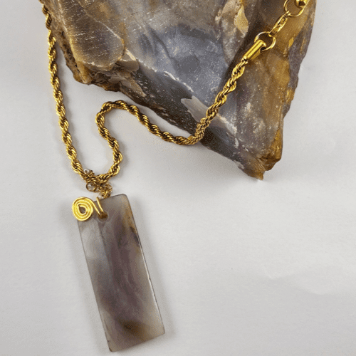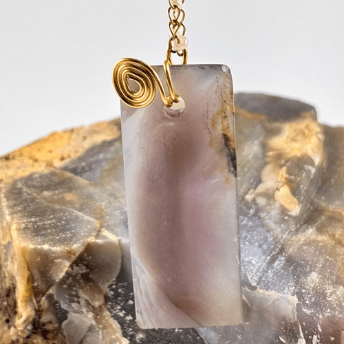 El detalle en alambre dorado, trabajado a mano, aporta un contraste cálido y elegante que realza la belleza natural de la piedra. Es un accesorio delicado pero cargado de carácter, ideal para quienes buscan llevar consigo un fragmento de calma, luz suave y energía sutil.