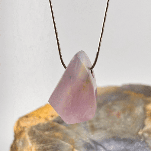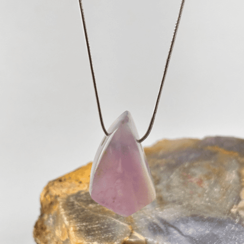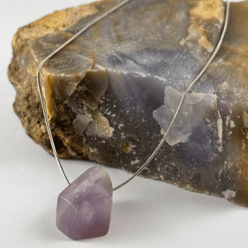 Gota Jacaranda de Calcedonia es un collar calcedonia lavanda única inspirada en los tonos suaves y etéreos de las flores de jacaranda. Tallada de forma artesanal, esta piedra presenta matices lilas y rosados que se funden delicadamente, creando un efecto sereno y lleno de armonía.