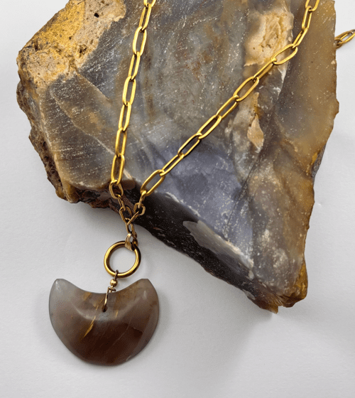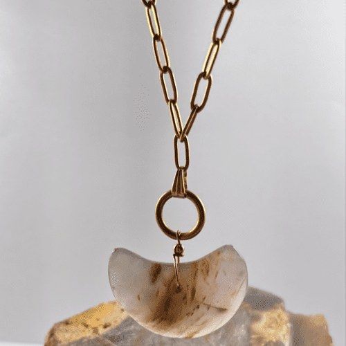 Media Luna Dorada” es una pieza artesanal elaborada con calcedonia costarricense en tonos suaves y translúcidos, atravesada por vetas naturales que le dan un carácter auténtico y orgánico. Su forma de media luna evoca equilibrio, feminidad y renovación, símbolo clásico de los ciclos que acompañan a la naturaleza.