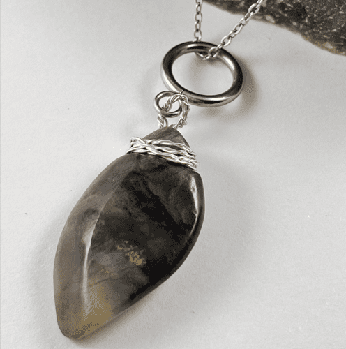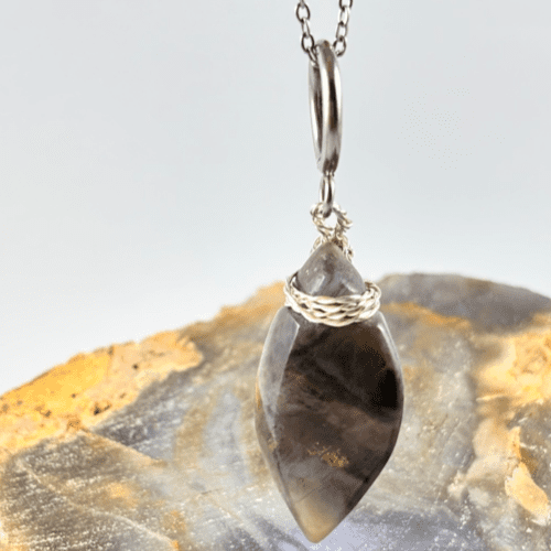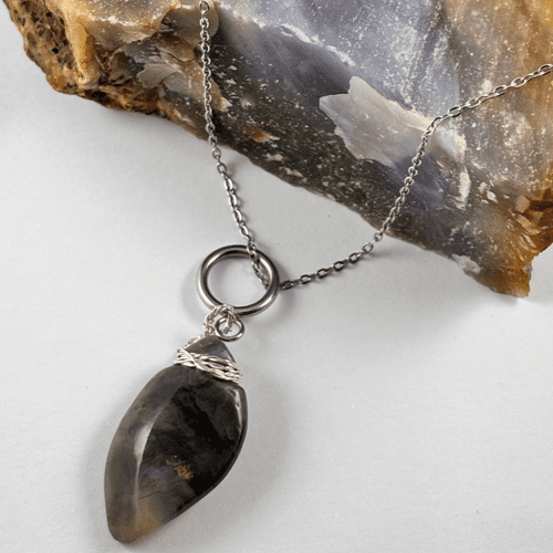La piedra está engarzada a mano con delicado alambre plateado, formando un detalle artístico que realza su forma orgánica. La acompaña una cadena de acero inoxidable, resistente, moderna y perfecta para uso diario sin perder su brillo.